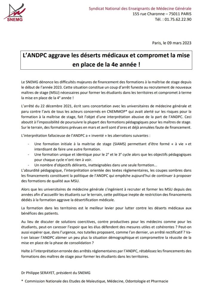 Communiqué de presse du SNEMG : L’ANDPC aggrave les déserts médicaux et compromet la mise en place de la 4e année ! 9 mars 2023